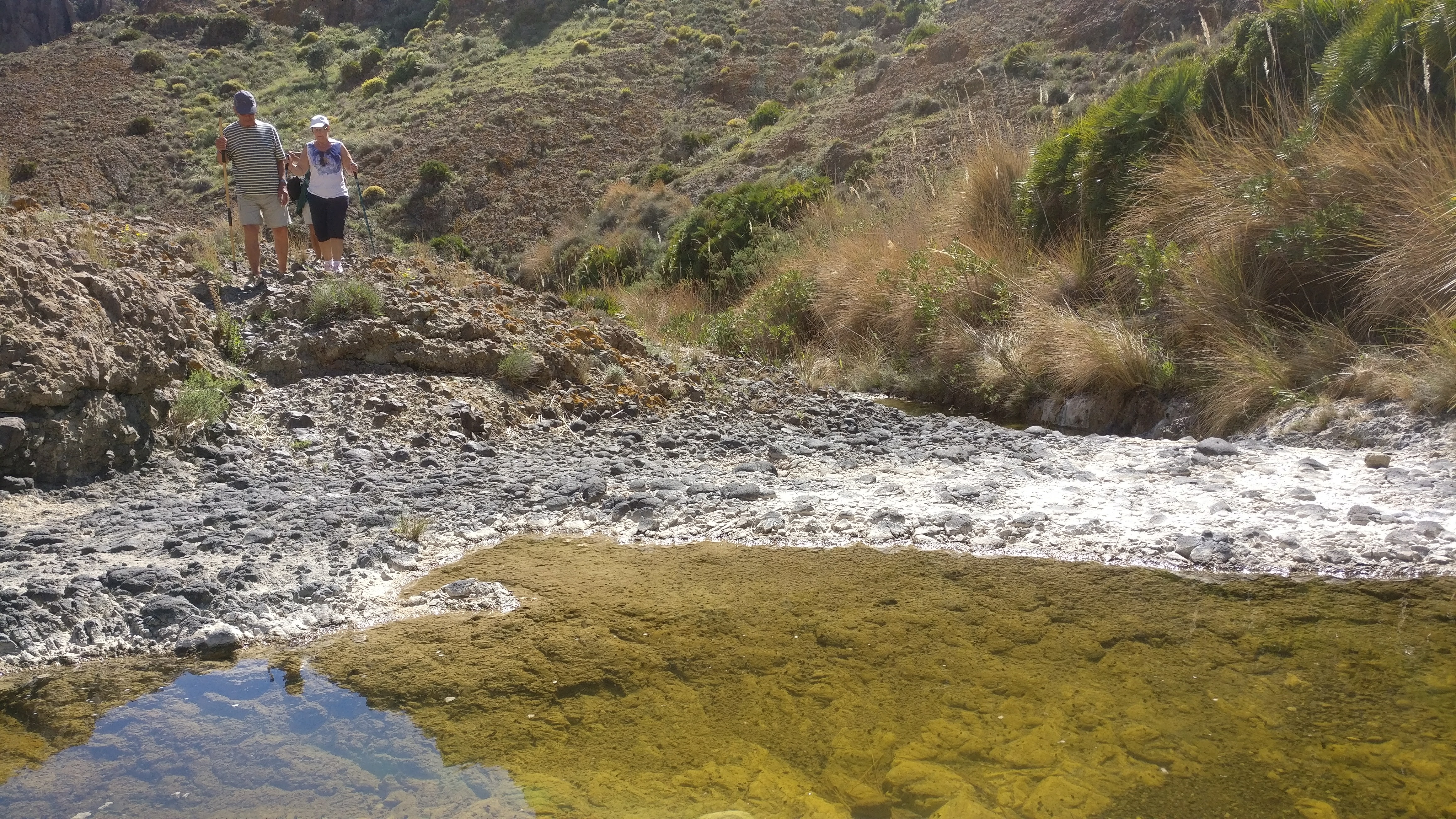 De Barranca van Las Negras is een rivierbedding waar hier en daar inderdaad waterpartijen zijn. Dat is heel uitzonderlijk. Waterlopen en rivieren staan hier meestal droog. We noemen ze rambla’s (droge rivierbedding) Een barranca is een ravijn. Er zouden schildpadden zitten, maar wij hebben ze niet gezien. Kikkers wel. Je kunt de barranca ongeveer 2 km volgen tot aan een piepklein huis. Manfred zou er voolgens vrienden wonen, maar hij was niet thuis. Hij beschikt er over water uit een diepe ondergrondse waterlaag via een waterput die nog dateert uit de tijd van de moren.