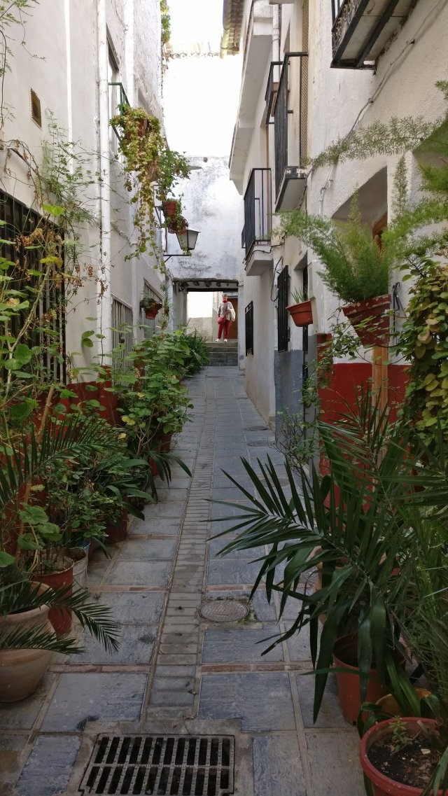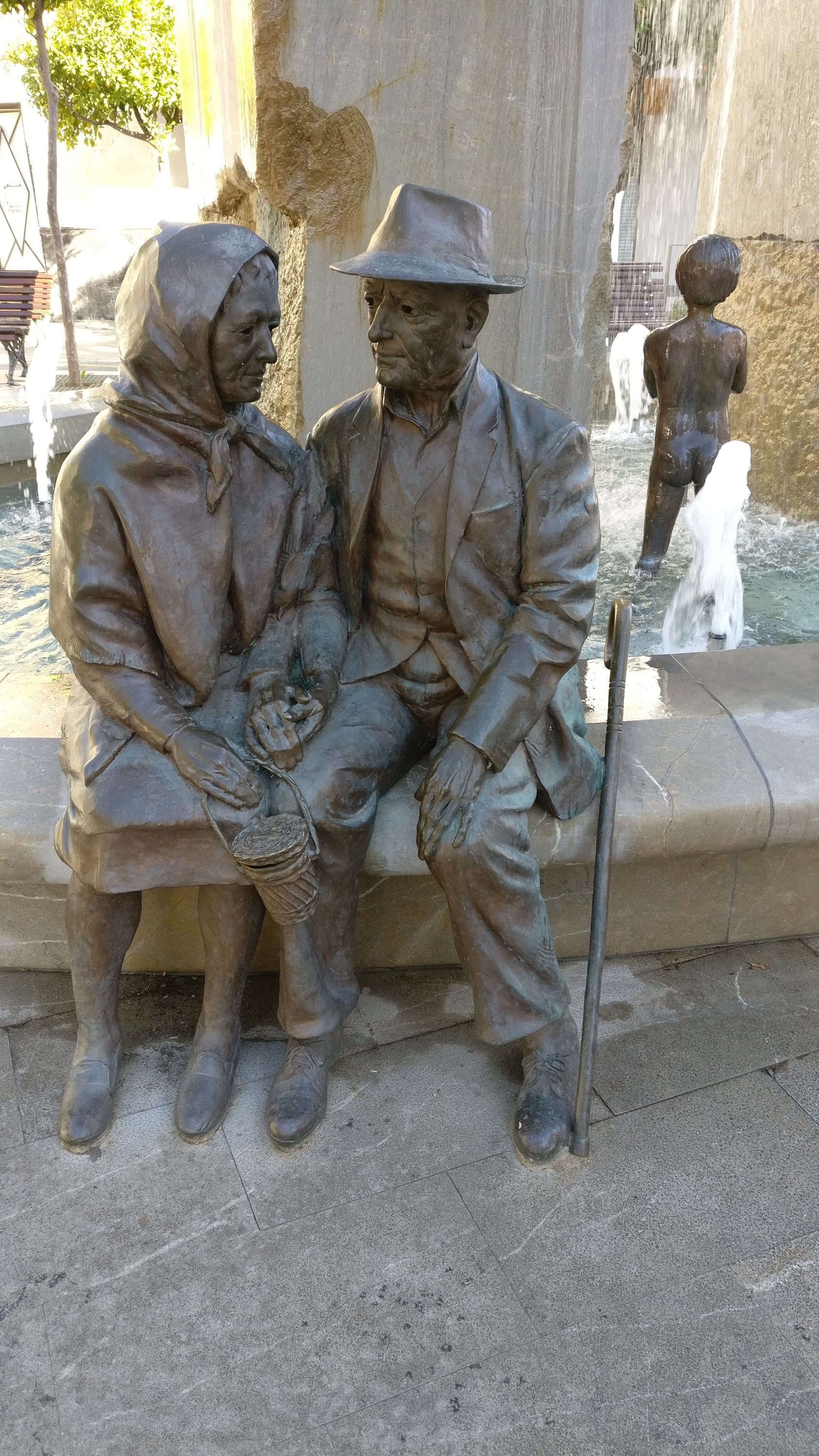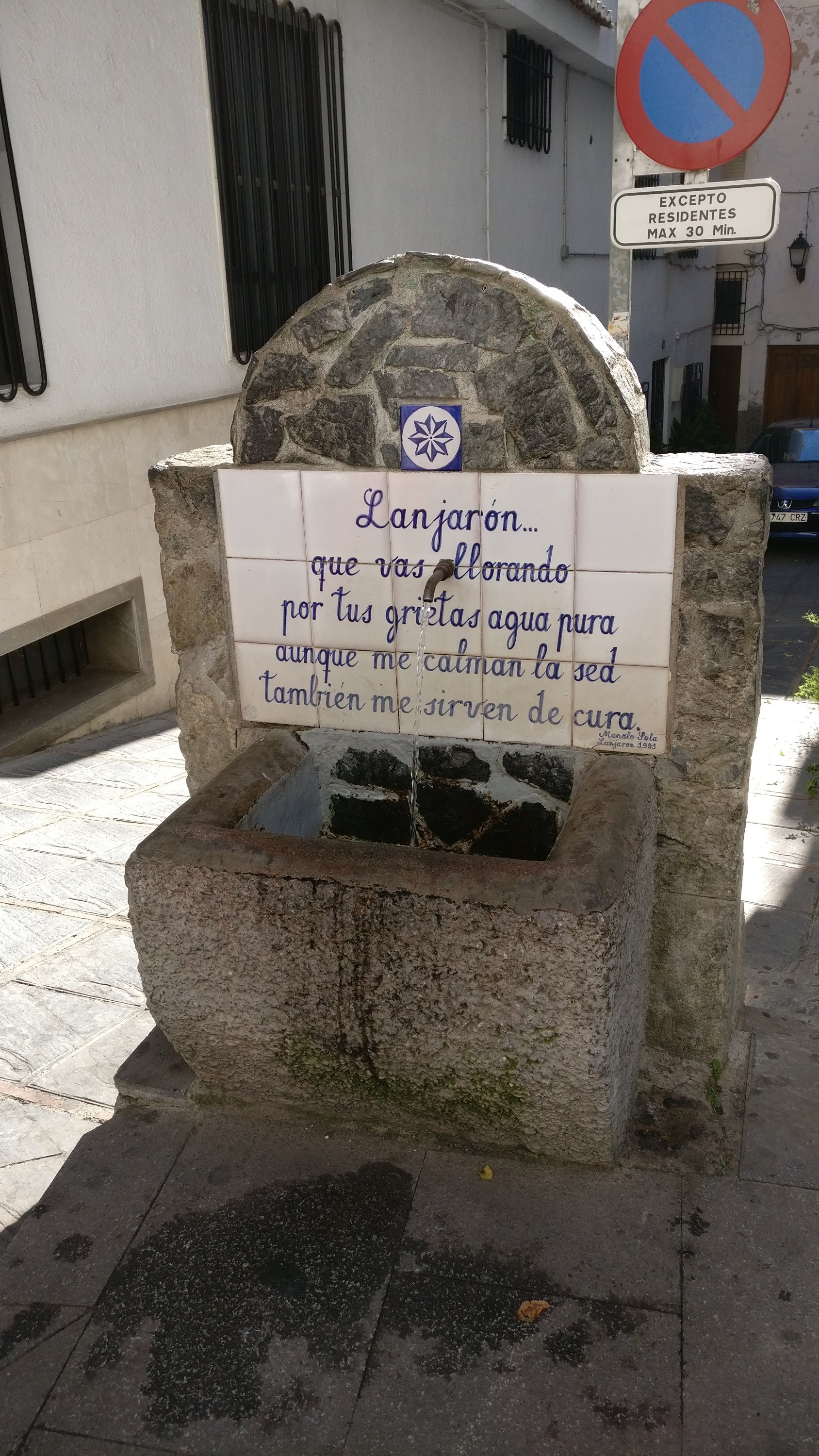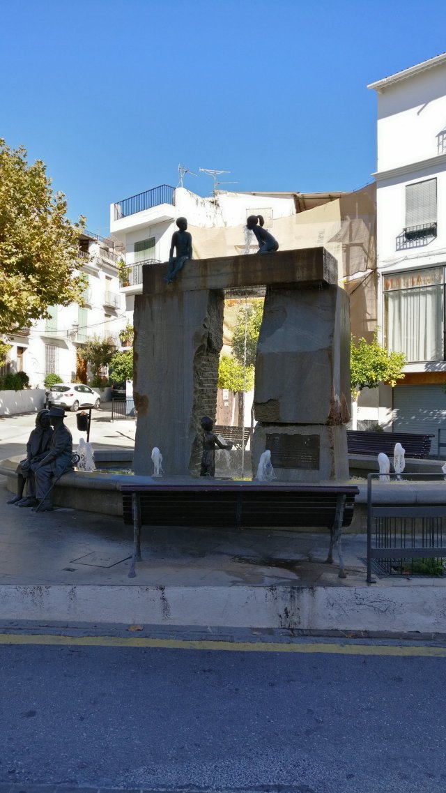 Op de terugweg van Cordoba via Granada en Motril hielden we halt in Lanjaron. Een kuuroord in de Alpujarras. Zeer gemakkelijk te bereiken via een brede 5 km lange asfaltweg. Het was zondag en zeer druk. Blijkbaar zijn er nogal wat Spanjaarden die er een daguitstap van maken. We bezochten het”balnearium” (kuuroord) met de bronnen. In het toerismebureau wezen ze ons ook de weg naar een bijzondere wijk met kleine pittoreske straatjes. Er is verder ook een heel mooie fontein met een opa en oma en hun in het water spelende kleinkinderen.