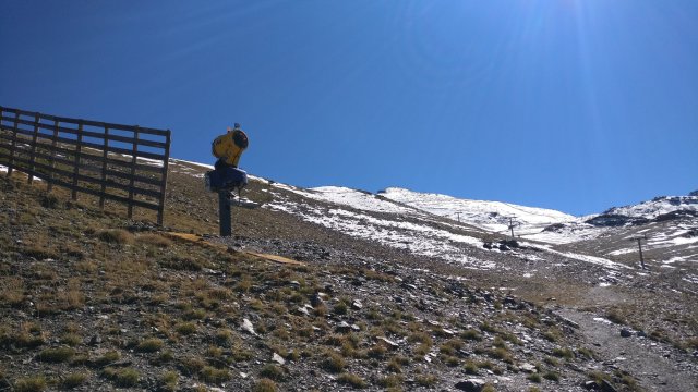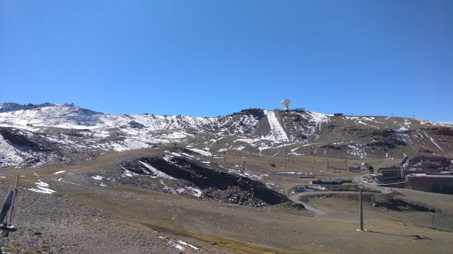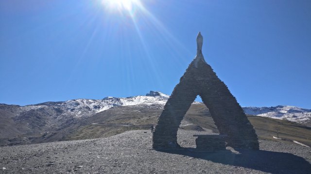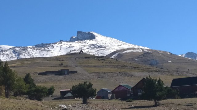 Iconsche top van de Veleta. Overal zichtbaar in Granada. Net voor de sneeuw zie je het monument van de Virgen de las Nieve.
