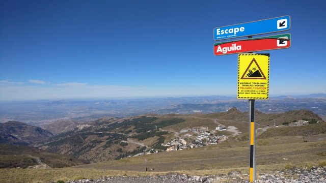 Wegwijzers voor de skipistes. Beneden zie je Pradollano liggen.