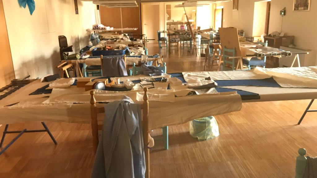 In Lorca zijn de processies tijdens de viering van de Semana Santa spectaculair. Ze kregen dan ook de erkenning als “Intéres Turistico International”. Er zijn zes broederschappen, maar twee ervan zijn de allergrootste en zijn een beetje elkaars concurrenten. In voetbal termen zou ik zeggen de “Witte” en de “Blauwe”. De “Paso Blanco” en de “Paso Azul”. Beiden hebben een indrukwekkend museum waar ze hun kostuums tentoonstellen. Die kledij op zich is bijzonder waardevol borduurwerk met zijde, goud en zilverdraad. Wat in Lorca een hele traditie van borduurwerkers voortbrengt. Inclusief een standbeeld voor de borduurwerkster. Aan die kostuums wordt trouwens nog steeds verder gewerkt. Op de foto’s krijg je min of meer een beeld. En als je het filmpje op youtube bekijkt (er zijn er veel) over die processies dan krijg je een beeld waarover het gaat: de hele bijbel wordt spectaculair uitgebeeld. (klik op de link hierna voor één van de filmpjes op youtube.)