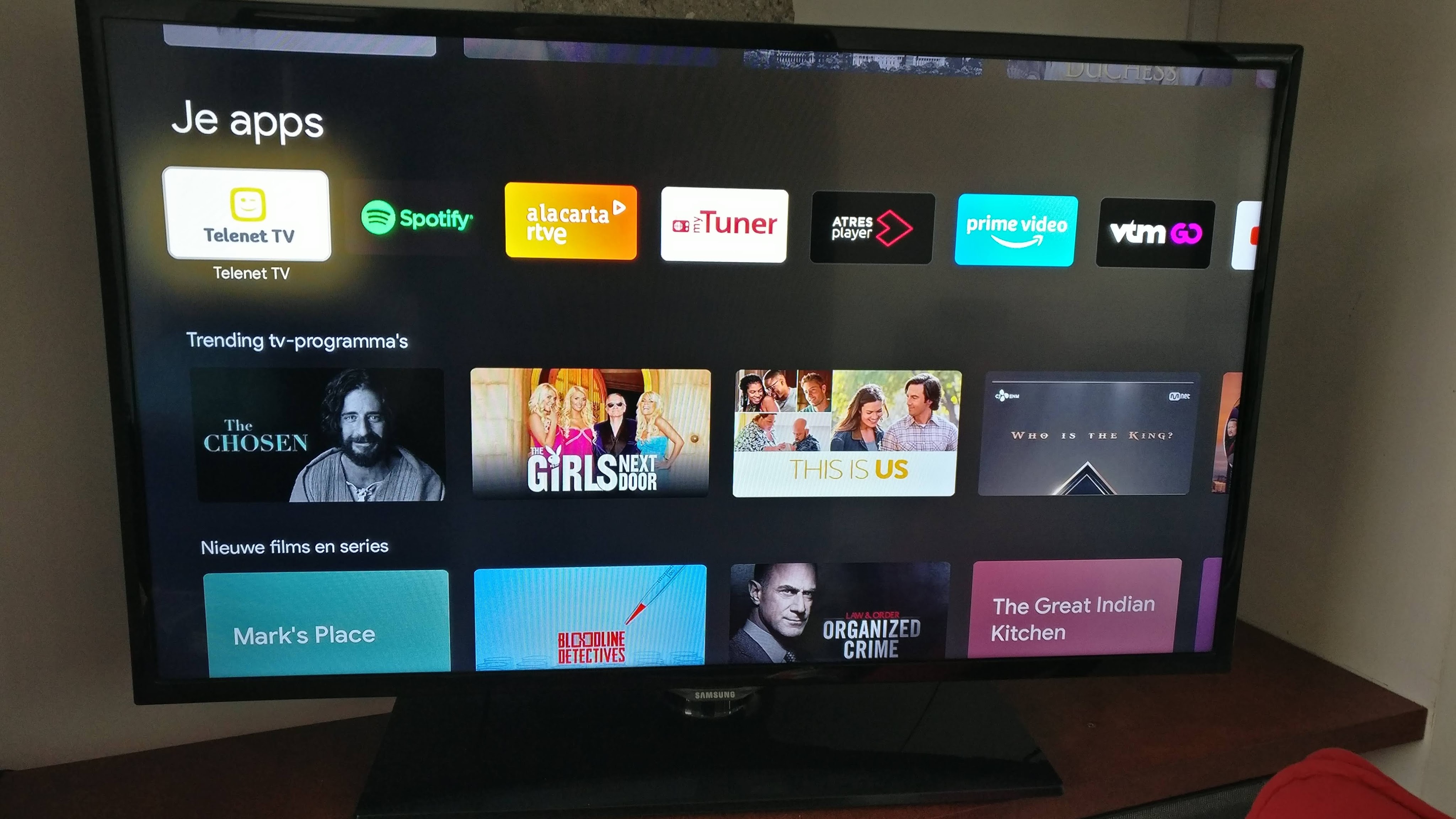 Zo heb ik er de app van mijn Belgische abonnement van Telenet op gezet. Zo kan ik nu zonder gebruik te maken van mijn GSM via de afstandsbediening kiezen naar wat ik kijk. Er is zelfs op deze afstandsbediening een knop geïnstalleerd om rechtstreeks naar Youtube of Neftflix te switchen.