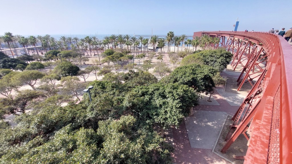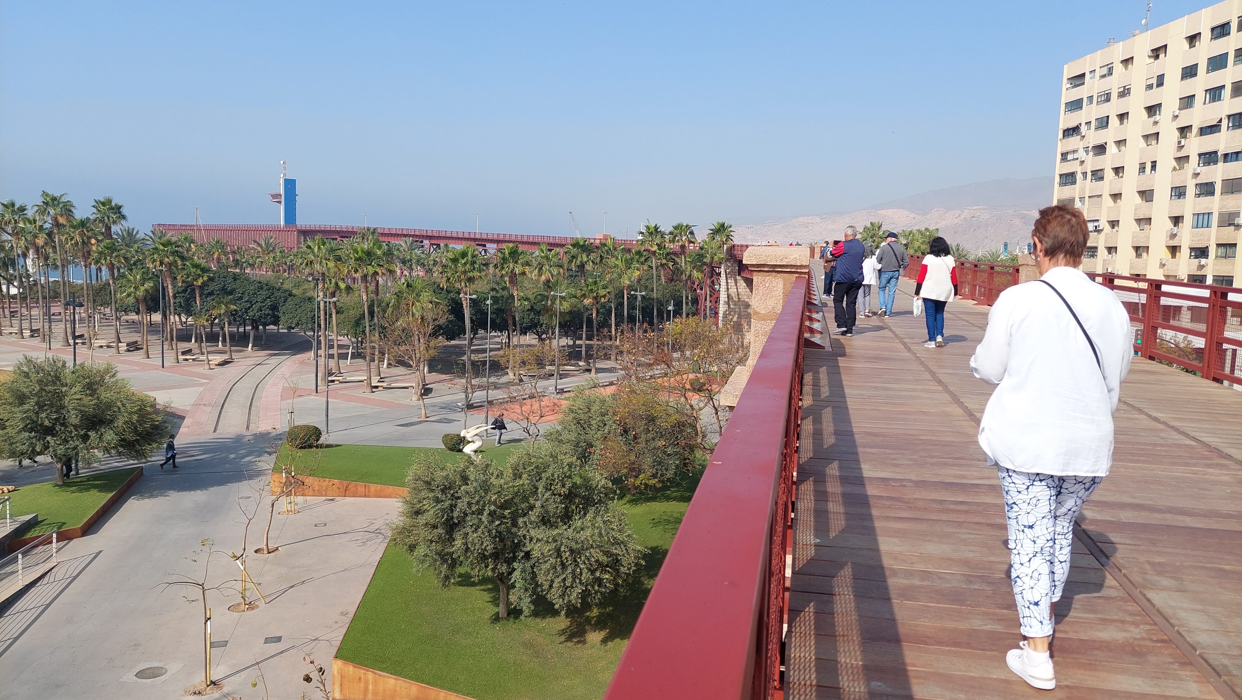 De totale lengte is ongeveer 800 m. en rolstoeltoegankelijkIn het parkHet bouwwerk werd in de ateliers van Eifel ontworpen.Het Gran Hotel, het rad op het begin van de Pasei De GraciaMonument voor de inwoners van Almeria gestorven in het concentratiekamp van Mauthausen.De jachthavenHier kun je het Alcazaba en het grote heiligenbeeld zienHet havenhoofd.Bovenaan zeer verrassend vier sporen naast elkaar.