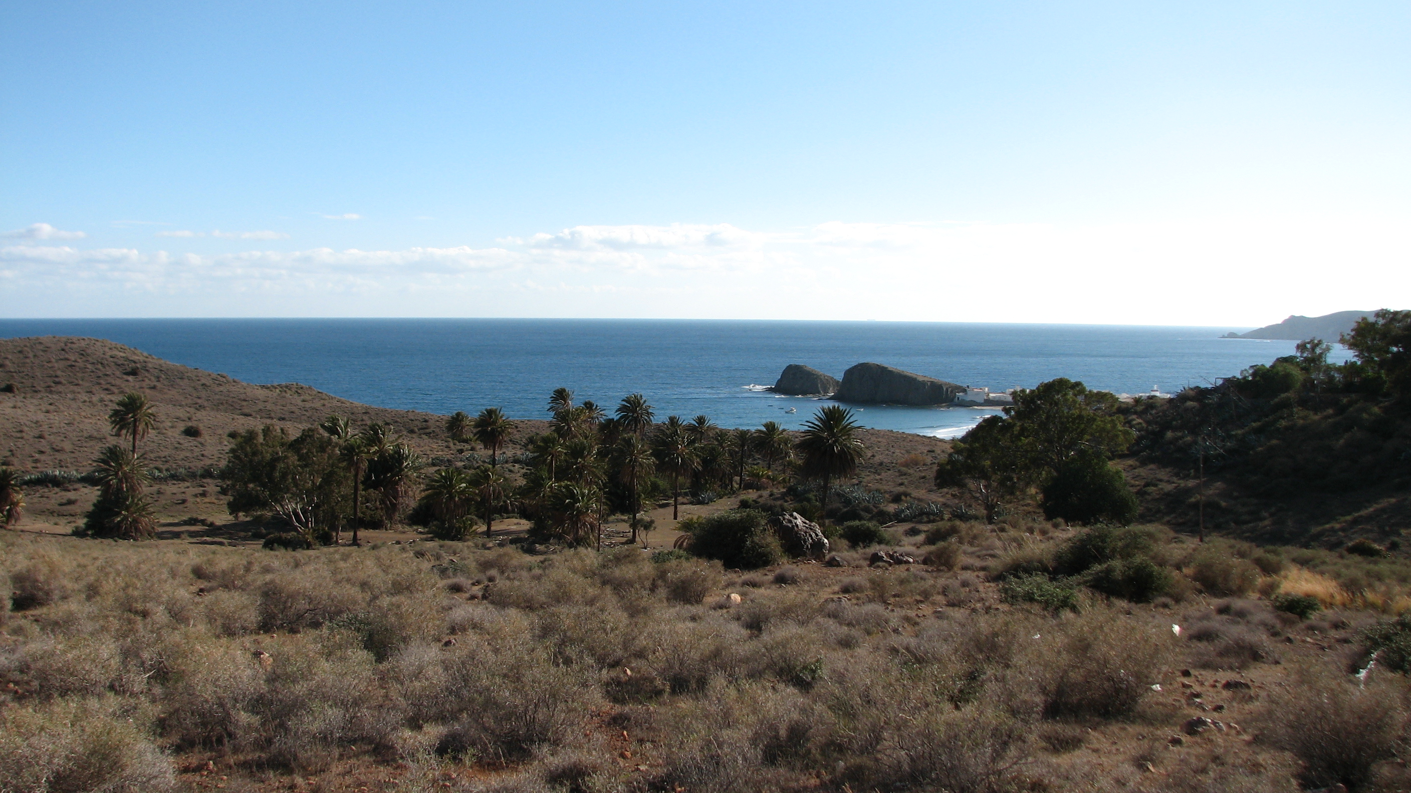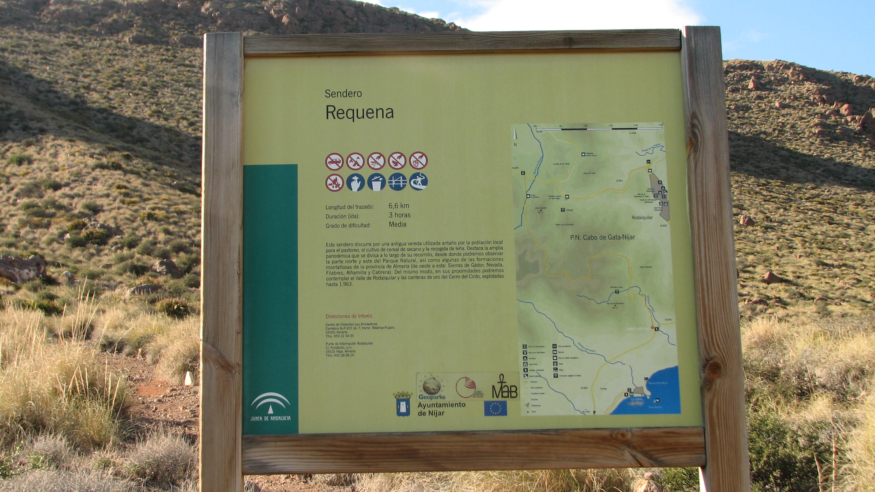 Het startpunt van deze wandeling ligt langsheen de baan van Rodalquilar naar Los Escullos. Een beetje voorbij het uitzichtpunt “Ametista”. Op dezelfde plaats waar links een wandelweg loopt naar een strandje “Cala de los Toros”, begint aan de rechterkant van de baan een wandeling genoemd “Sendero Requena”. Op het bord staat aangegeven dat de wandeling 6,6 km lang is en ongeveer 3 uren duurt. Wij deden er inclusief de picknick 5 uren over. Vooral het eerste deel bergop is vrij lastig. Daar deden wij 1u15 minuten over. Bovenaan heb je een schitterend uitzicht van 360°.